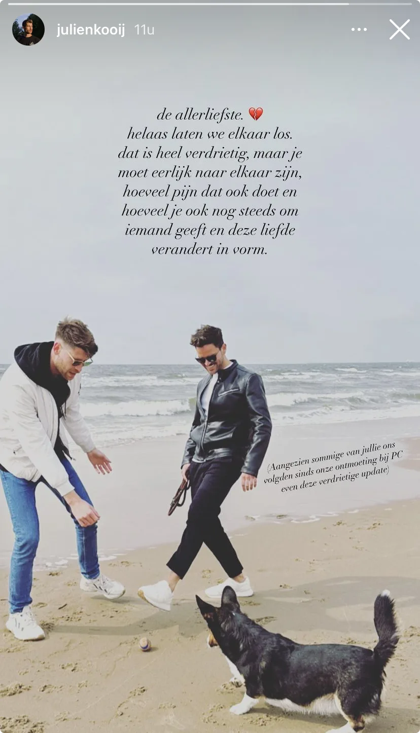 Juliën laat in zijn Instagram Stories weten dat ze eerlijk naar elkaar moeten zijn. "Dat is heel verdrietig, maar je moet eerlijk naar elkaar zijn, hoeveel pijn dat ook doet en hoeveel je ook nog steeds om iemand geeft en deze liefde verandert in vorm."