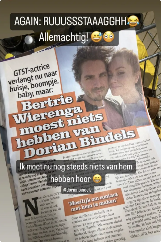 Diverse bladen, waaronder Story, hebben Berties uitspraken overgenomen en hun eigen conclusies getrokken. Bertie schrok zich rot van de artikelen en laat via Instagram haar reactie weten op de bladen, "RUSTAAAAGGGH". Daarbij plaatst ze een foto van een artikel uit een roddelblad.