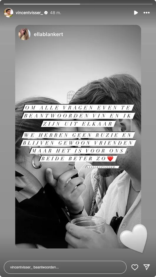 "Om alle vragen even te beantwoorden Vin en ik zijn uit elkaar", begint de ex-vriendin van Vincent haar Instagram-Story met een foto van hun samen op de achtergrond. "We hebben geen ruzie en blijven gewoon vrienden, maar het is beter voor ons beide zo."