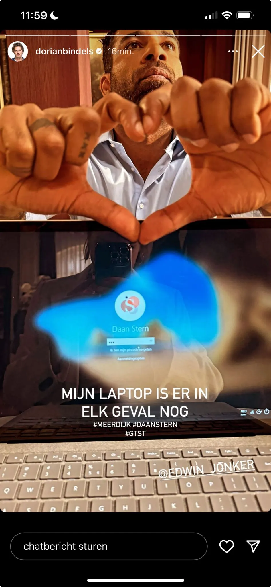Deze week deelde Dorian in zijn verhaal een foto van een computer waarop de inloggegevens van Daan Stern, zijn personage in Goede Tijden Slechte Tijden, te zien zijn in de Rozenboom, het bekende restaurant in de serie. Hij schrijft erbij: "Mijn laptop is er in elk geval nog." Op de achtergrond zie je Edwin Jonker, een bekende GTST-speler.