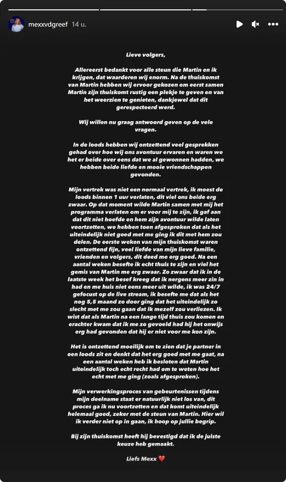 Mexx laat weten dat het "ontzettend moeilijk" is om je partner opgesloten te zien in een tv-programma zonder dat die weet hoe slecht je je voelt. Ze vond dat Martin het recht had om te weten hoe het haar verging.