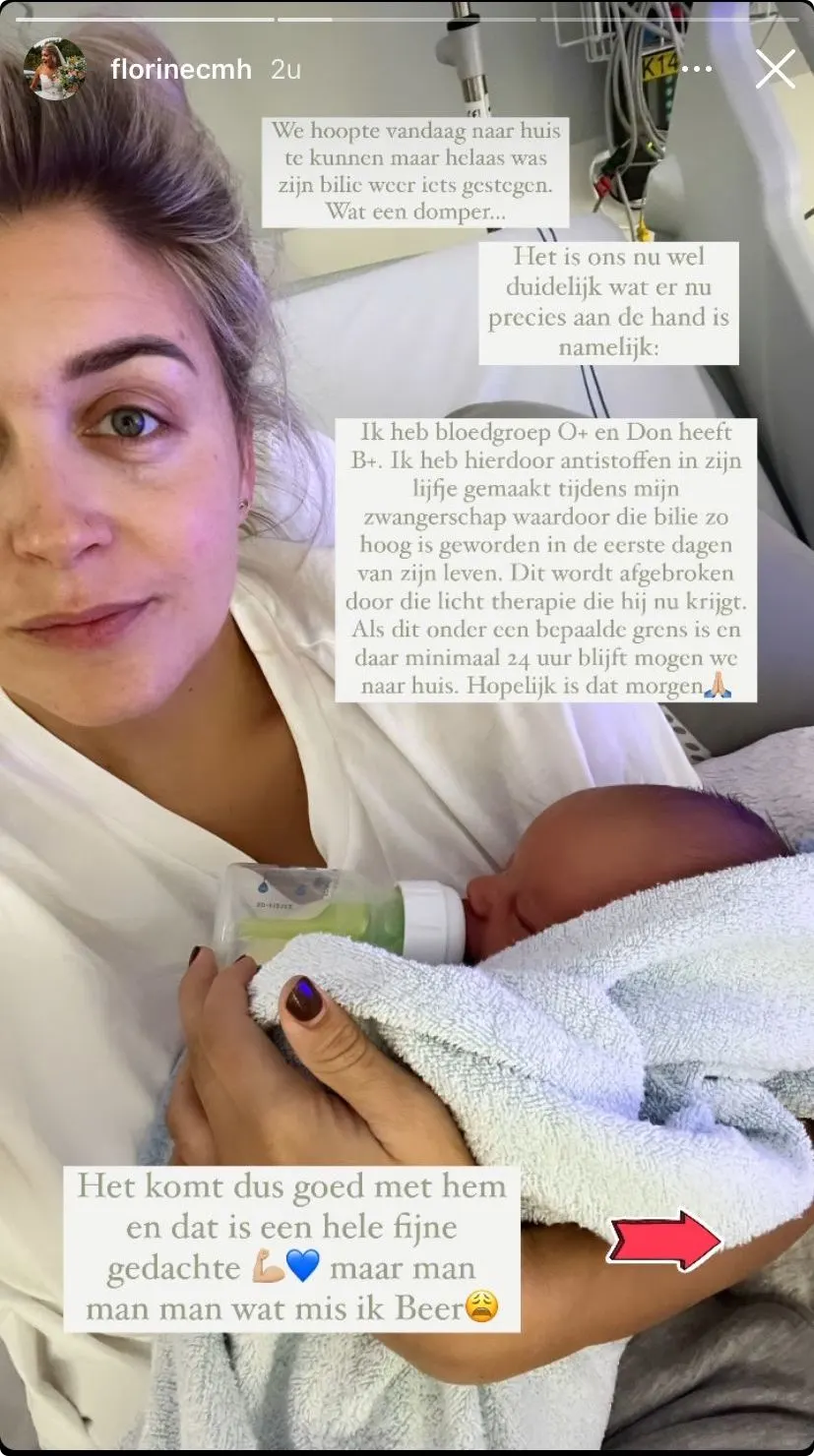 De reden de pasgeboren baby zo ziek is geworden, is inmiddels bekend: "Ik heb bloedgroep O+ en Don heeft B+. Ik heb hierdoor antistoffen in zijn lijfje aangemaakt tijdens mijn zwangerschap waardoor de waardes zo hoog zijn geworden in de eerste dagen van zijn leven", aldus de blondine.