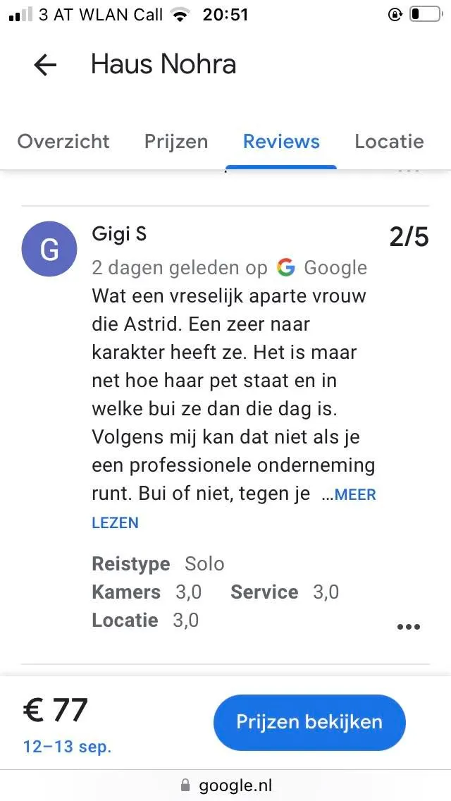 Zo luidt de recensie als volgt: "Wat een vreselijk aparte vrouw, die Astrid. Een zeer naar karakter heeft ze. Het is maar net hoe haar pet staat en in welke bui ze dan die dag is. Volgens mij kan dat niet als je een professionele onderneming runt." De recensie lijkt inmiddels te zijn verwijderd.