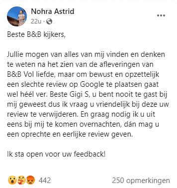 Astrid laat het het hier niet bij zitten en heeft zich over de ongelukkige review uitgelaten. "Beste B&B kijkers, Jullie mogen van alles van mij vinden en denken te weten na het zien van de afleveringen van B&B Vol liefde", begint Astrid. "Maar om bewust en opzettelijk een slechte review op Google te plaatsen gaat wel héél ver. Beste Gigi S, u bent nooit te gast bij mij geweest dus ik vraag u vriendelijk bij deze uw review te verwijderen", vervolgt de B&B-eigenares.