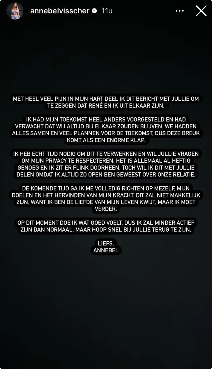 Afgelopen weekend hebben ze onverwacht een punt achter hun relatie gezet, zo viel te lezen op sociale media. “Met heel veel pijn in mijn hart deel ik dit bericht met jullie om te zeggen dat René en ik uit elkaar zijn", begon Annebel. "Ik had mijn toekomst heel anders voorgesteld en had verwacht dat wij altijd bij elkaar zouden blijven. We hadden alles samen en veel plannen voor de toekomst, dus deze breuk komt als een enorme klap.”