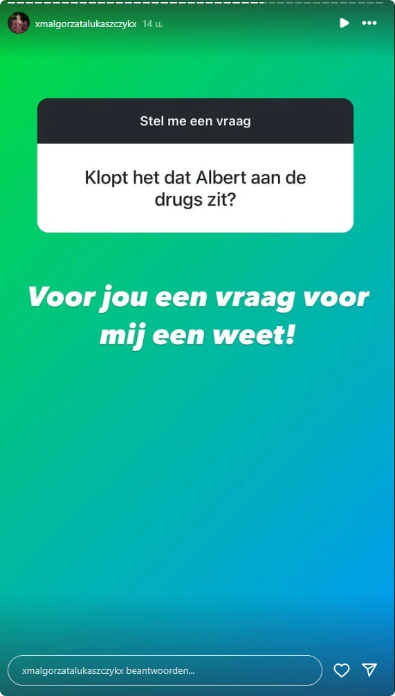 In haar vragenrondje op Instagram antwoordt Malgosia op het volgende gerucht: "Klopt het dat Albert aan de drugs zit?" Malgosia reageert hierop het volgende: "Voor jou een vraag, voor mij een weet!"