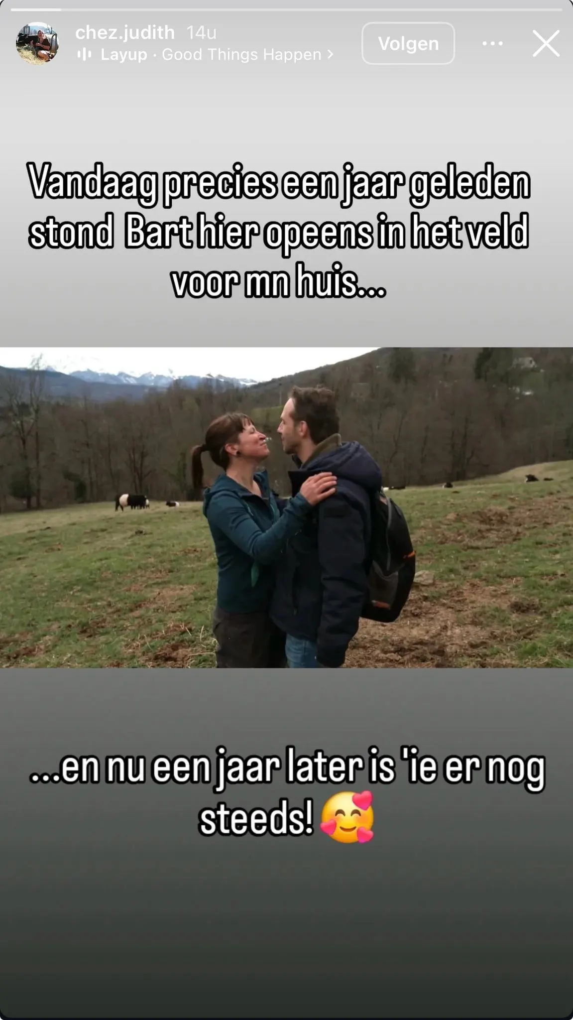 "Vandaag precies een jaar geleden stond Bart hier opeens in het veld voor mijn huis...", schrijft Judith in haar Instagram Stories. "En nu een jaar later is hij er nog steeds!", vervolgt ze. Op de foto is hun eerste ontmoeting in de Franse bergen te zien.