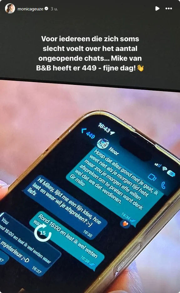 "Voor iedereen die zich soms slecht voelt over het aantal ongeopende chats... Mike van B&B heeft er 449. Fijne dag!", zo schrijft Monica in haar Instagram Stories bij een foto van de telefoon van Mike.