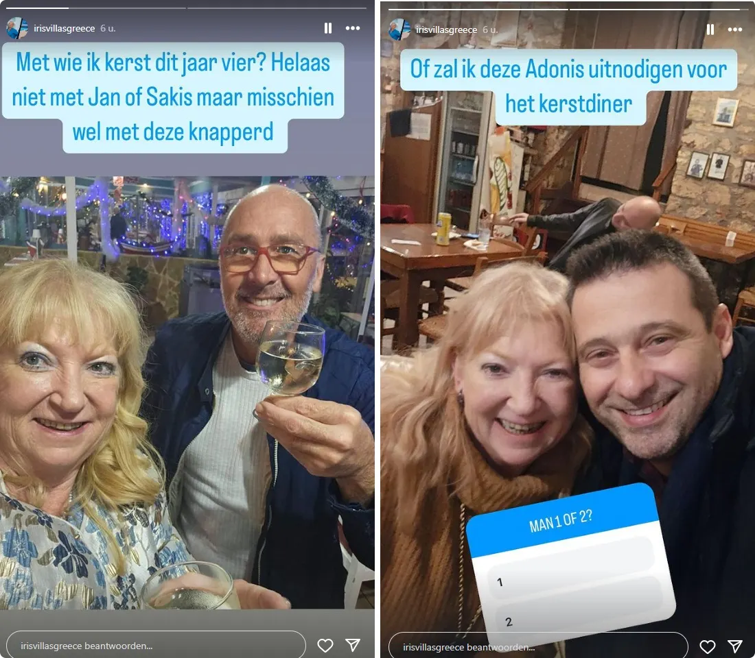 Jan is namelijk al weer vertrokken bij Iris. Op de socials zien we dat Jan een tussenstop heeft gemaakt in Athene, op de weg terug naar ons kikkerlandje. Iris bevestigt dat zelf ook: "Met wie ik kerst dit jaar vier? Helaas niet met Jan of Tzakis, maar misschien wel met deze knapperd?” Gevolgd door een tweede foto met een man: "Of zal ik deze adonis uitnodigen voor het kerstdiner?” Waarom Jan voortijdig weder is gekeerd naar Nederland, is (nog) niet bekend.