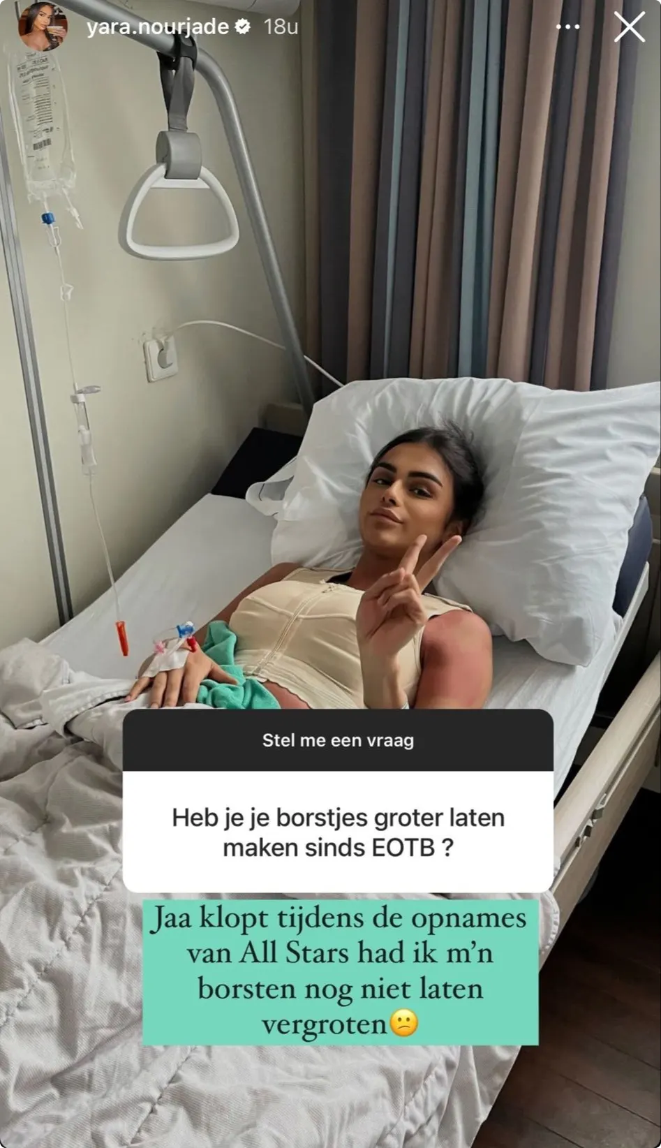 Yara Nour houdt een vragenrondje op haar Instagram en daar krijgt ze de vraag of zij "haar borsten groter heeft laten maken" sinds het programma. "Ja klopt, tijdens de opnames van All Stars had ik m'n borsten nog niet laten vergroten." Daarna dus wel en ze deelt daarbij een foto van het moment nadat ze onder het mes is gegaan.