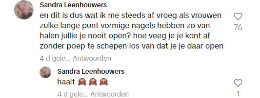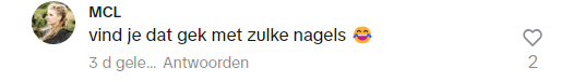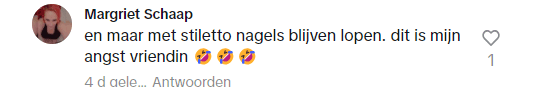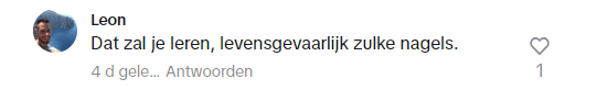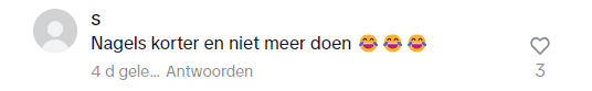 Kijkers lijken allemaal niet verbaasd te zijn en geven Christina haar lange nagels de schuld. Zo valt in de comments te lezen: ''Dat zal je leren, levensgevraarlijk zulke nagels'', en ''Nagels korter en niet meer doen.''