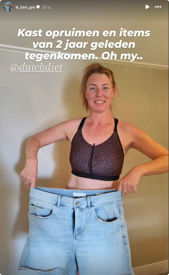 "Kast opruimen en items van twee jaar geleden tegenkomen. Oh my...", zo schrijft Greetje in haar Instagram Stories. Te zien is dat ze een broek in haar handen heeft die inmiddels veel te groot is. Ze vervolgt in een volgend bericht met: "Toch aardig verschil!"