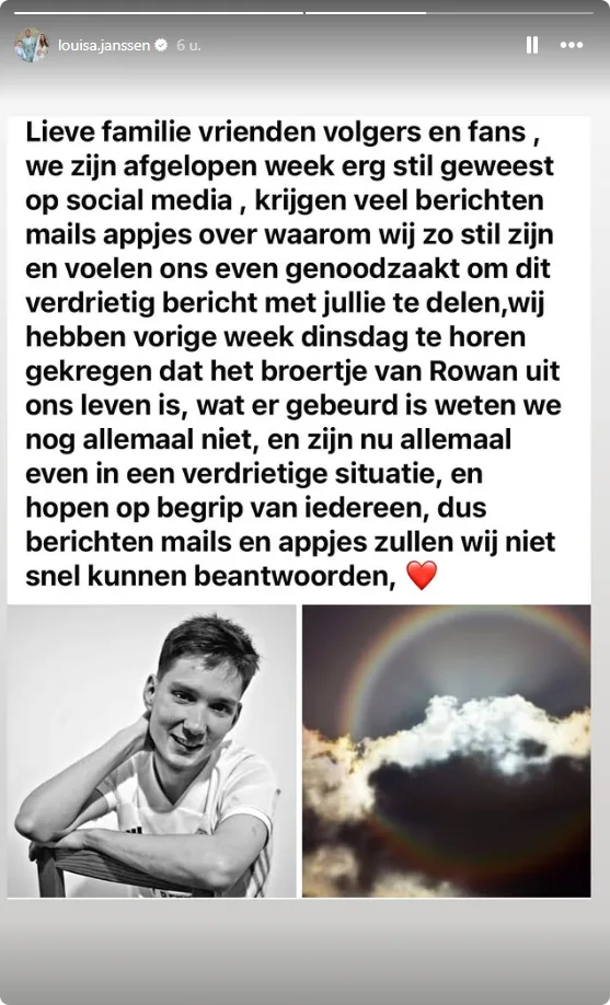 In 2022 verloor Louisa haar eigen broer, Shownieuws sprak haar eerder over dit verdriet (zie video). De realityster schrijft dat ze van veel volgers de vraag kreeg waarom zij en Rowan stil waren op Instagram de afgelopen week. "Voelen ons even genoodzaakt om dit verdrietige bericht te delen. Wij hebben vorige week dinsdag te horen gekregen dat het broertje van Rowan uit ons leven is", is te lezen op haar stories.