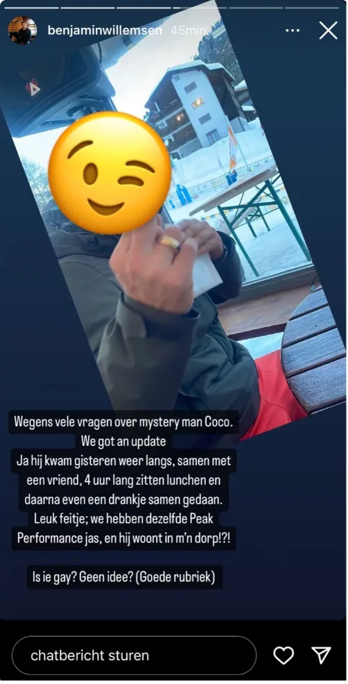 Tijdens het programma Winter Vol Liefde leek er kort iets op te bloeien tussen Benjamin en Joshua, die eerder terugblikte op het programma (zie video). Helaas veranderde deze prille relatie snel in een hevige ruzie, waardoor beide mannen uiteindelijk weer single en alleen eindigden. Toch lijkt het erop dat Benjamin de liefde heeft gevonden. In zijn Instagram-story schrijft hij over zijn avontuur met de mysterieuze Coco...