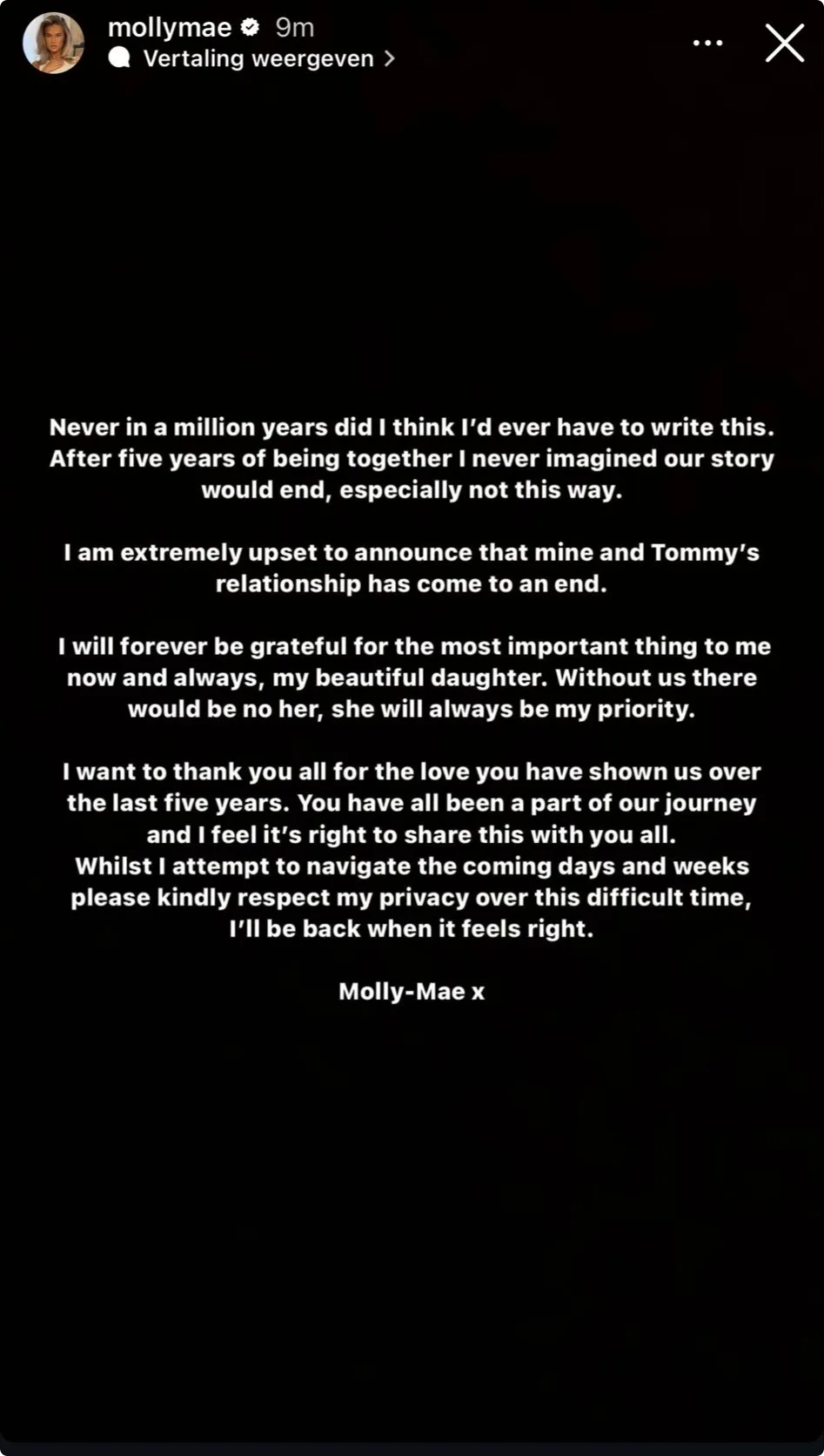"In geen miljoen jaar had ik gedacht dit te moeten schrijven. Na vijf jaar samen zijn had ik niet verwacht dat ons verhaal zou eindigen, zeker niet op deze manier", begint Molly haar bericht. "Ik ben ontzettend overstuur dat ik moet laten weten dat mij en Tommy's relatie tot een einde is gekomen."