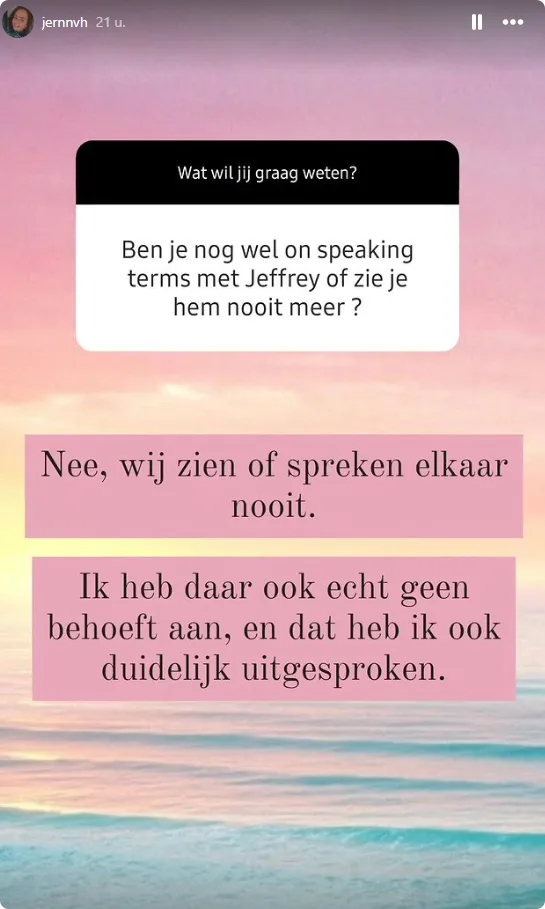 In een vragenrondje op Instagram wordt aan de reality-ster gevraagd of ze nog contact met Jeffrey heeft. "Nee, we zien of spreken elkaar nooit", begint Jerney. Ze heeft daar echt geen behoefte aan en heeft dat ook duidelijk uitgesproken.