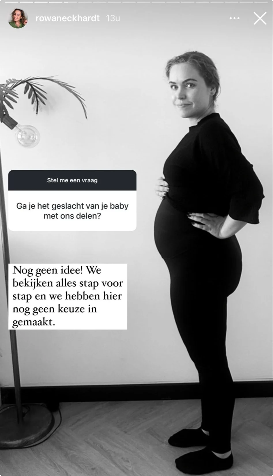 Een volger vraagt haar ook of ze het geslacht van de kleine van te voren al bekend gaan maken. Bij een foto waarop ze haar babybuik showt (zie hieronder) schrijft ze: "Nog geen idee! We bekijken alles stap voor stap en we hebben hier nog geen keuze in gemaakt."