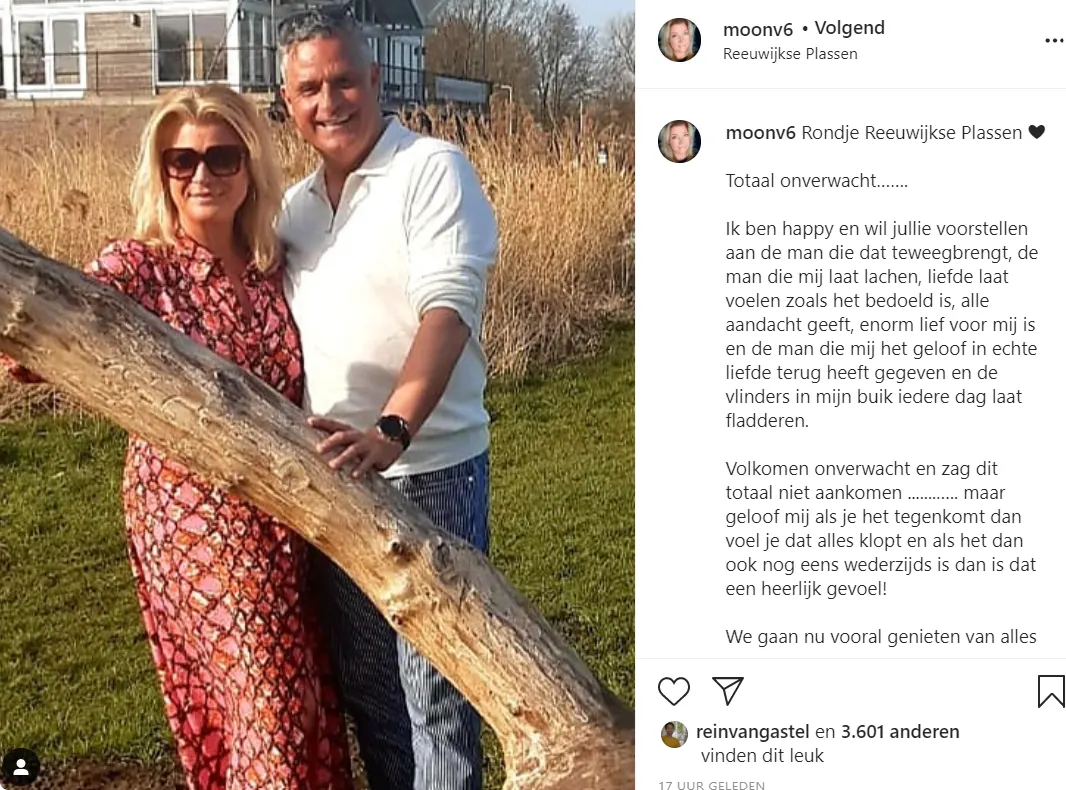 Nog geen jaar na haar tv-bruiloft met Aron, is ze hoteldebotel geworden op een andere man. Tot haar eigen schrik! "Volkomen onverwacht en zag dit totaal niet aankomen, maar geloof mij: als je het tegenkomt dan voel je dat alles klopt en als het dan ook nog eens wederzijds is dan is dat een heerlijk gevoel!" "We gaan nu vooral genieten van alles en elkaar", besluit Monique haar bericht. Hieronder zie je een foto van het gelukkige stel.