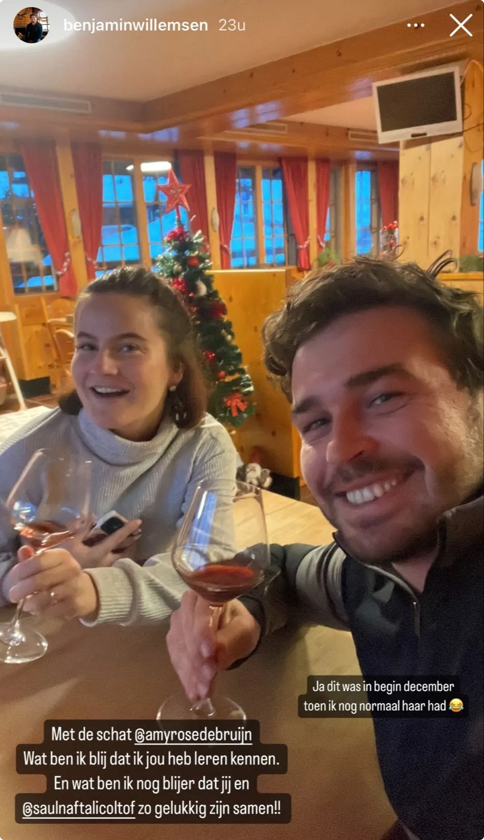 "Met de schat Amy Rose", deelt hij bij een foto van hun samen waarop ze aan het borrelen zijn. "Wat ben ik blij dat ik jou heb leren kennen. En wat ben ik nog blijer dat jij en Saul zo gelukkig zijn."