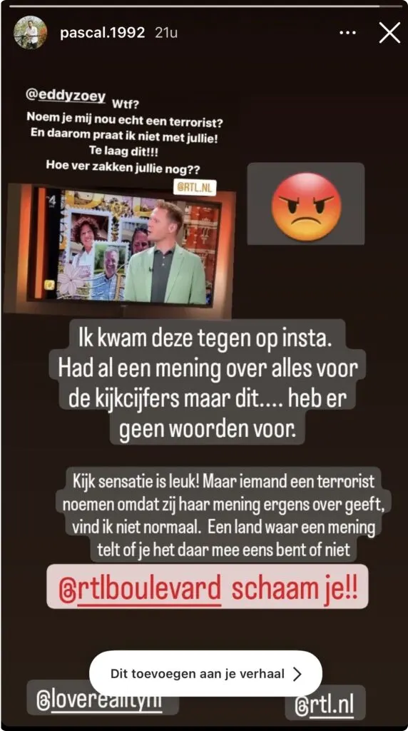 "Ik kwam deze [verwijzend naar een post van Denise, red.] tegen op insta. Had al een mening over 'alles voor de kijkcijfers', maar dit...", stelt Pascal op Instagram. "Heb er geen woorden voor."