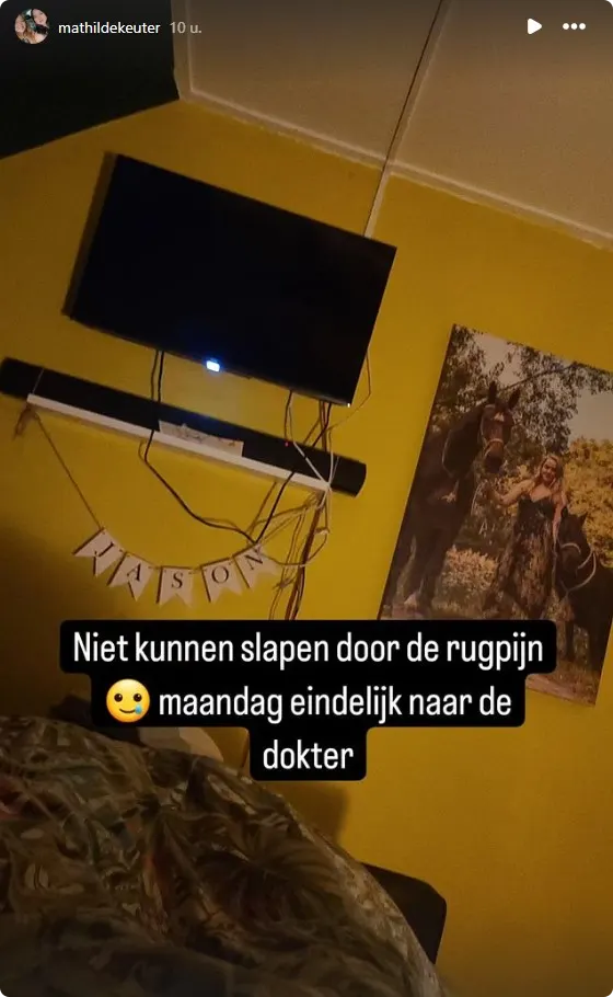 De realityster plaatst zondagnacht een foto met de volgende tekst: "Niet kunnen slapen door de rugpijn. Maandag eindelijk naar de dokter." Dit is niet de eerste keer dat Mathilde zich slecht voelt tijdens de zwangerschap. Eerder deelde de realityster dat ze een buikgriep had. "Ik voel me enorm oncomfortabel", schreef ze destijds.