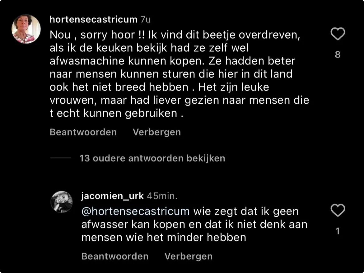 Onder de post van Shownieuws, over het cadeau van Michelle, schrijft iemand: "Nou, sorry hoor! Ik vind dit een beetje overdreven. Als ik de keuken bekijk, had ze zelf wel een afwasmachine kunnen kopen. Ze hadden het beter kunnen sturen naar mensen die het hier in dit land ook niet breed hebben. Het zijn leuke vrouwen, maar ik had liever gezien dat het naar mensen gaat die het echt kunnen gebruiken." Iemand anders is het hier mee eens: "Ze krijgt toch gewoon betaald voor deze tv-klus? Daar kan ze wel tien vaatwassers van kopen"