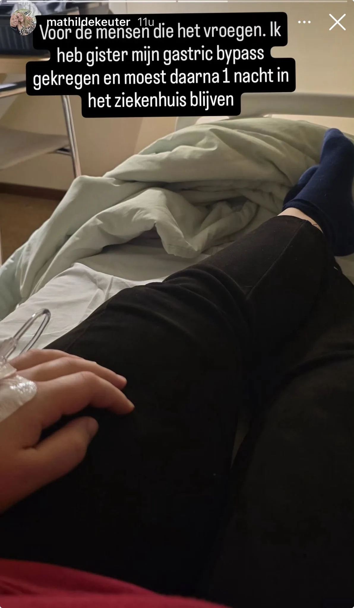 Op Instagram deelt Mathilde met haar volgers dat ze een nacht moest blijven. "Voor de mensen die het vroegen. Ik heb gisteren mijn gastric bypass gekregen en moest daarna een nacht in het ziekenhuis blijven."