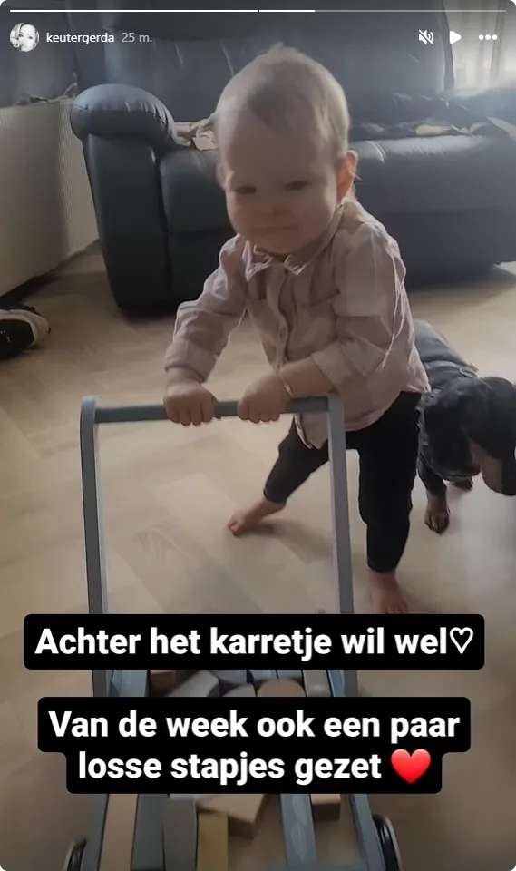 "Achter het karretje wil wel", zo schrijft Gerda in haar Instagram Stories. Ze deelt vervolgens bijzonder nieuws: "Van de week ook een paar losse stapjes gezet."