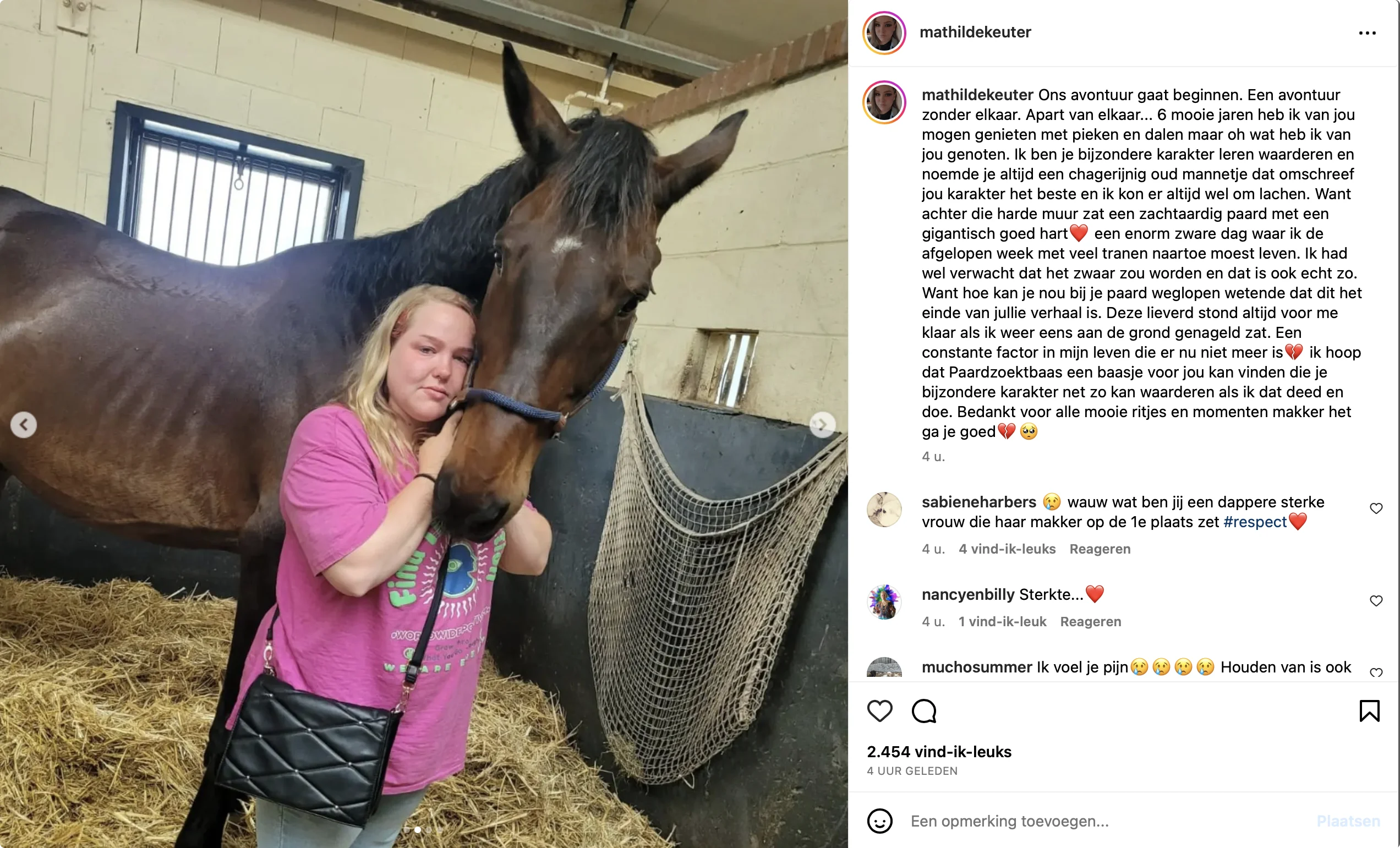 Mathilde laat weten dat deze dag enorm zwaar voor haar was en dat ze veel tranen heeft gelaten. "Ik had wel verwacht dat het zwaar zou worden en dat is ook echt zo. Want hoe kan je nou bij je paard weglopen wetende dat dit het einde van jullie verhaal is. Deze lieverd stond altijd voor me klaar als ik weer eens aan de grond genageld zat."