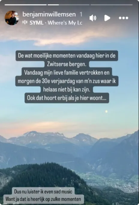 Benjamin schrijft hierover: "Het zijn wat moeilijke momenten vandaag hier in de Zwitserse bergen. Vandaag is mijn lieve familie vertrokken en morgen is de 30e verjaardag van mijn zus, waar ik helaas niet bij kan zijn. Ook dat hoort erbij als je hier woont..."