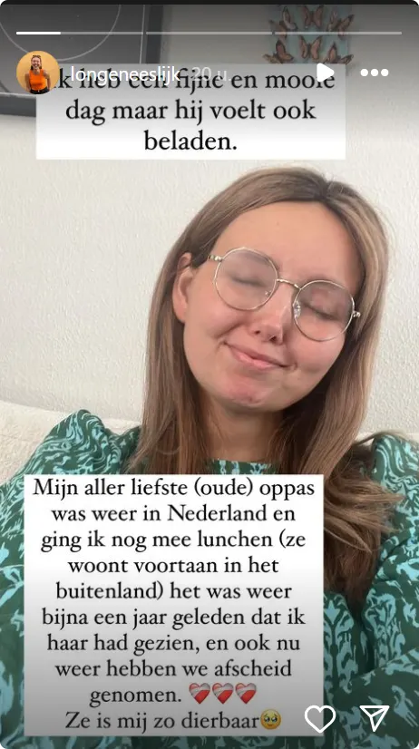 Eva plaatst een foto van zichzelf in haar verhaal en schrijft daarbij: "Ik heb een fijne en mooie dag, maar hij voelt ook beladen." De beladen gevoelens komen doordat Eva iemand heel bijzonders ontmoette: haar oude oppas. Deze oppas was heel belangrijk in Eva's jeugd en voelde als een tweede moeder voor haar. Omdat Eva nu in het buitenland woont, zien ze elkaar niet vaak meer.