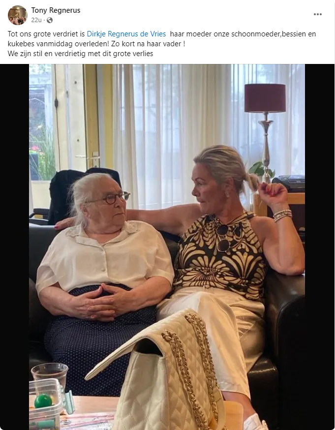 "De moeder van Derrekien is afgelopen zondag overleden", vertelt Tony. Ook op Facebook deelt hij een eerbetoon aan zijn schoonmoeder: "Tot ons grote verdriet is Derrekien haar moeder vanmiddag overleden! Zo kort na haar vader! We zijn stil en verdrietig met dit grote verlies."