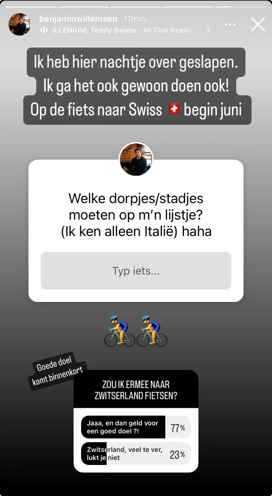 Op Instagram deelt Benjamin zijn besluit met zijn volgers, waarbij hij openhartig schrijft: "Ik heb hier een nachtje over geslapen. Ik ga het ook gewoon doen. Op de fiets naar Swiss." Deze spontane en gedurfde keuze laat Benjamin's verlangen naar avontuur duidelijk zien.