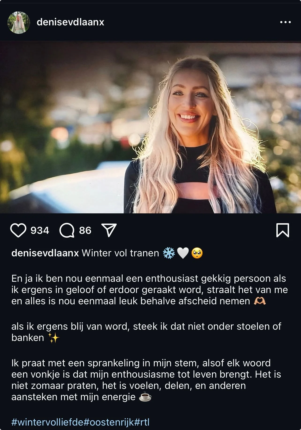 Op Instagram spreekt Denise dan ook over "een winter vol tranen". Ook reageert ze op kritiek op haar enthousiaste gedrag. "En ja, ik ben nou eenmaal een enthousiast, gekkig persoon. Als ik ergens in geloof of ergens door geraakt word, straalt het van me af. En alles is nou eenmaal leuk, behalve afscheid nemen. Als ik ergens blij van word, steek ik dat niet onder stoelen of banken", meent de dame.