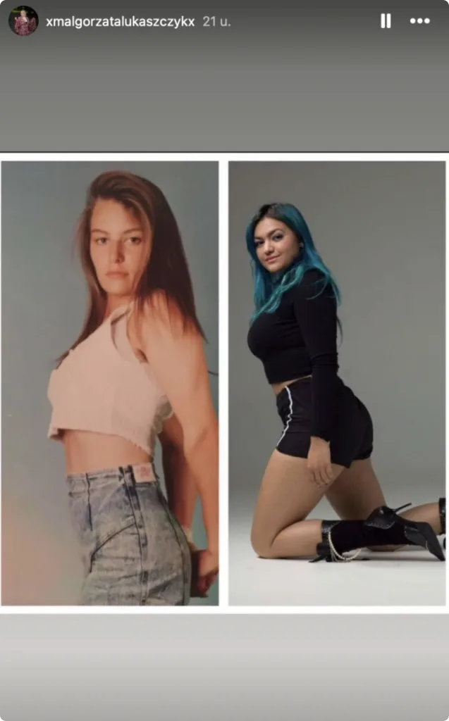 Malgosia heeft woensdag twee foto’s op haar Instagram Stories gedeeld. De linkerfoto is een oude foto van haarzelf, terwijl de rechterfoto een recent kiekje is van haar dochter. Nathalie is 24 jaar en is net als haar moeder erg muzikaal. Onder de artiestennaam Nathalie Blue heeft ze al diverse nummers uitgebracht én ze heeft ook al samengewerkt met grote Nederlandse artiesten als Frenna en Broederliefde.