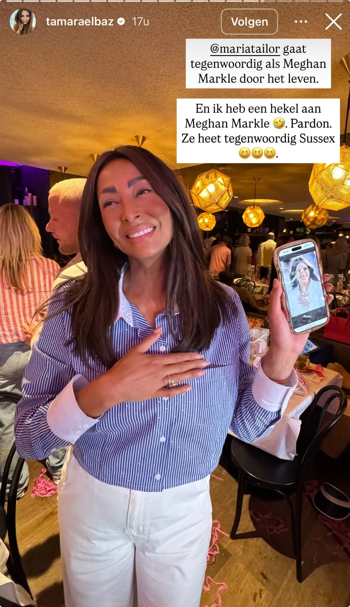 Ook vriendin Tamara Elbaz is aanwezig op het feest. Zij plaatst op haar Instagram Stories een foto van Maria waarin ze grapt dat haar vriendin op Meghan Markle lijkt. "Maria gaat tegenwoordig als Meghan Markle door het leven. Ik heb een hekel aan Meghan Markle. Pardon. Ze heet tegenwoordig Sussex", schrijft Tamara met lachende emojis.