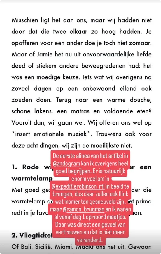 &C schrijft over haar beslissing: "Je opofferen voor een ander doe je toch niet zomaar. Maar of Jamie het nu uit onvoorwaardelijke liefde deed of stiekem andere beweegredenen had: het was een moedige keuze." Jamie reageert hier zelf op in haar Instagram Story met: "Ramon Brugman en ik waren al vanaf dag 1 op noord maatjes. Daar was direct een gevoel van vertrouwen en dat is niet meer veranderd."