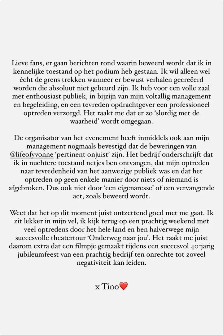 De zanger stond zaterdag op een bedrijfsfeest in Veghel van een grote modeketen. Hij heeft daar een half uur gezongen. Op beelden van het feest, die onder andere door Yvonne Coldeweijer werden gedeeld, is te zien hoe Tino veel praat en de microfoon vaak richting het publiek houdt om zelf niet te veel te zingen. Boze tongen beweren daarom dat hij een glaasje teveel ophad en dat de organisatie hem woest van het podium heeft gehaald, wat Tino zelf stellig ontkent.