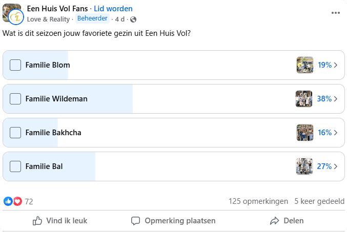 In een peiling onder leden van LoveReality's speciale Een Huis Vol-Facebookgroep, waar duizenden kijkers actief zijn, gaf afgelopen weekend maar liefst 38% van de stemmers aan dat de familie Wildeman hun favoriete gezin is. Daarmee laten ze de andere families van dit seizoen - Bal, Blom en Bakhcha - ver achter zich, met de nieuwste familie Bal op de tweede plaats.