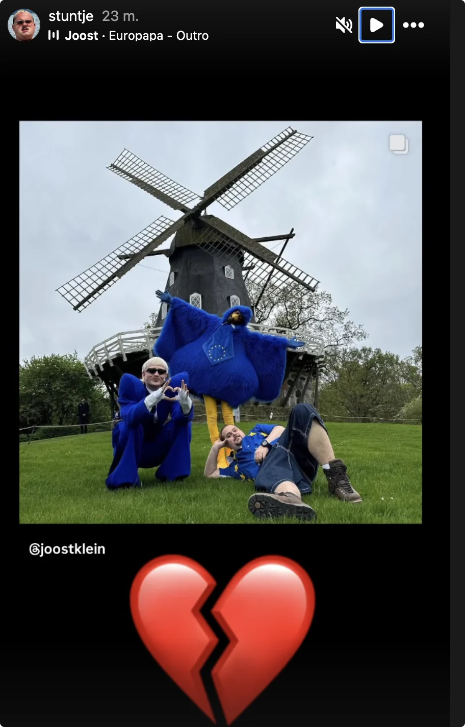 De Finse zanger Käärijä, die vorig jaar tweede werd op het Eurovisie Songfestival, leeft mee met zijn goede vriend Joost Klein. Op Instagram deelt hij in zijn Stories een emoji van een gebroken hart.