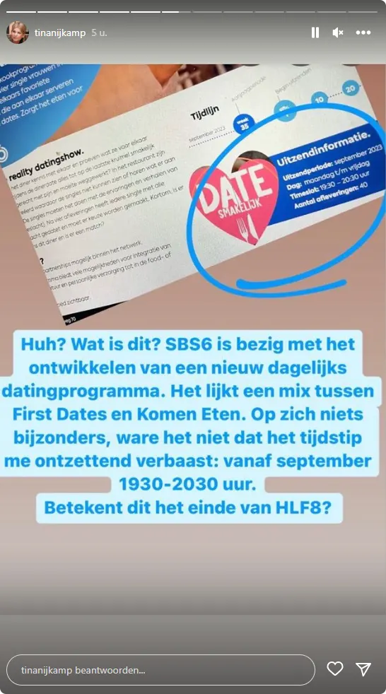 Komt er toch een einde aan Talkshow HLF8? Volgens Media Consultant Tina Nijkamp wel. Volgens haar schijnt er een datingprogramma op de tijd van HLF8 te komen. Dit schrijft ze in haar Instagram Story.