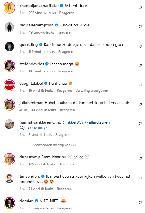 Bij Brams volgers valt de video ook goed in de smaak. De comments stromen vol met lachende smileys. Ook reageren mensen: ''Neeeee, de effort!!! De iconischheid!!! Hou op'' en ''Acht keer op repeat en lig nog te huilen van het lachen.'' Maan heeft de video zelf ook gezien en kan erom lachen. ''Samen dansles?'', reageert ze.